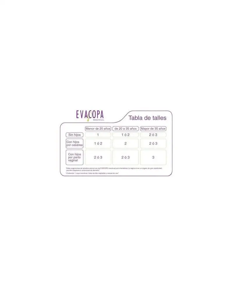 DESCRIPCIÓN EVACOPA es una copa menstrual para todas las edades disponible en tres talles. Elegí tu talle según la tabla orientativa que se encuentra en la imagen secundaria. Contenido: 1 copa menstrual, bolsa de tela respirable y manual de uso. Facil de colocar. Facil de extraer. Facil de higienizar. Es de silicona calidad farmaceutica para evitar desarrollo bacteriano. Apto vegano. Hipoalergenica, no altera el pH vaginal. Libre de aditivos, olores, colorantes toxicos. Es cómoda, se puede usar hasta por 12 horas continuas, y es segura (evita infecciones y no genera irritaciones). Reutilizable hasta por 5 años.