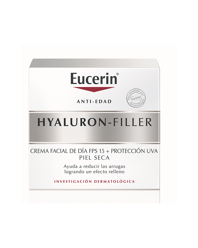 Eucerin HYALURON-FILLER Día Piel Seca, con una fórmula anti-arrugas avanzada con Ácido Hialurónico para piel seca diseñada para generar un efecto relleno de arrugas profundas. Con FPS 15 y protección UVA para prevenir el envejecimiento prematuro y que las arrugas se vuelvan más profundas. Modo Uso. Aplicación: 1) Limpiá la piel con Eucerin DermatoCLEAN Leche Limpiadora 2) Tonificá con Eucerin DermatoCLEAN Tónico Facial para preparar la piel para el siguiente producto de cuidado 3) Aplicá Eucerin HYALURON-FILLER Crema de Día para piel seca en rostro, cuello y escote, masajeando la crema suavemente en la piel. Evitá el contacto con los ojos. Para intensificar los beneficios rellenadores de arrugas, usala junto con Eucerin HYALURON-FILLER Crema de Contorno de Ojos, Crema de Noche y Concentrate como parte de una rutina diaria para el cuidado de la piel.