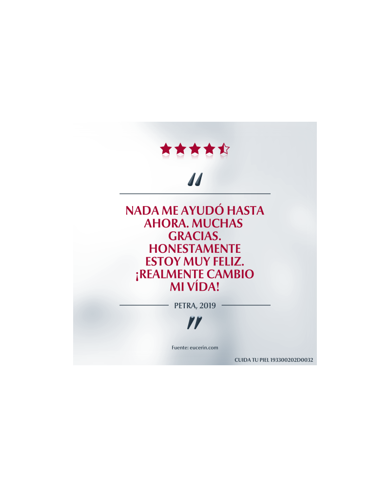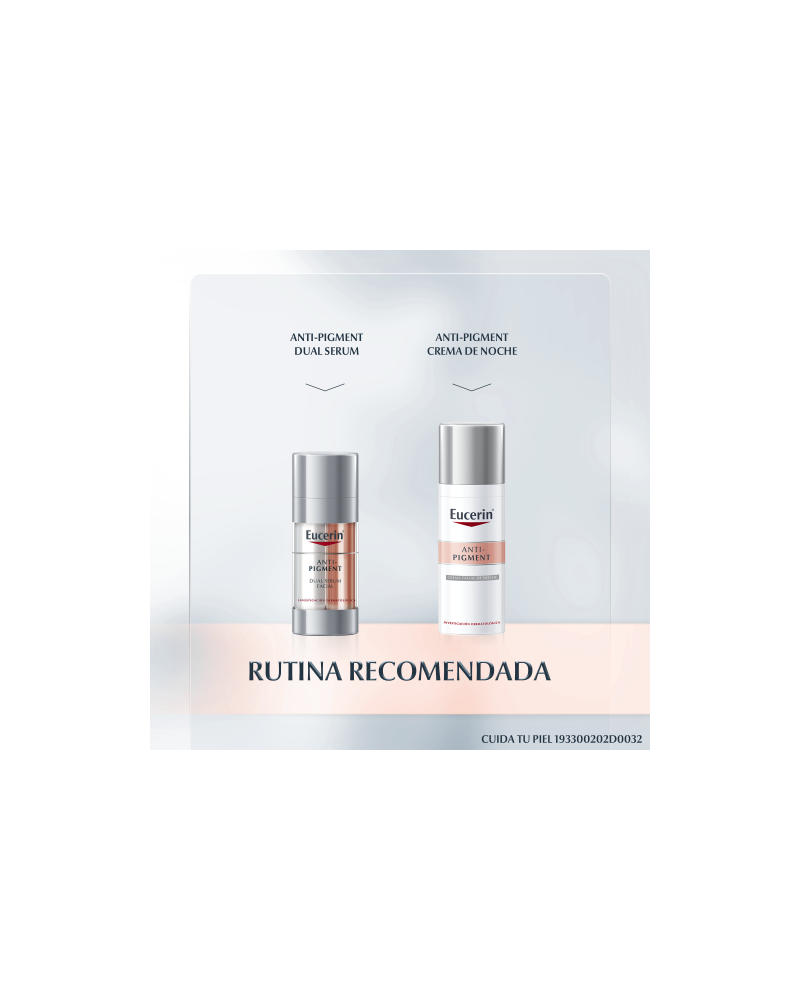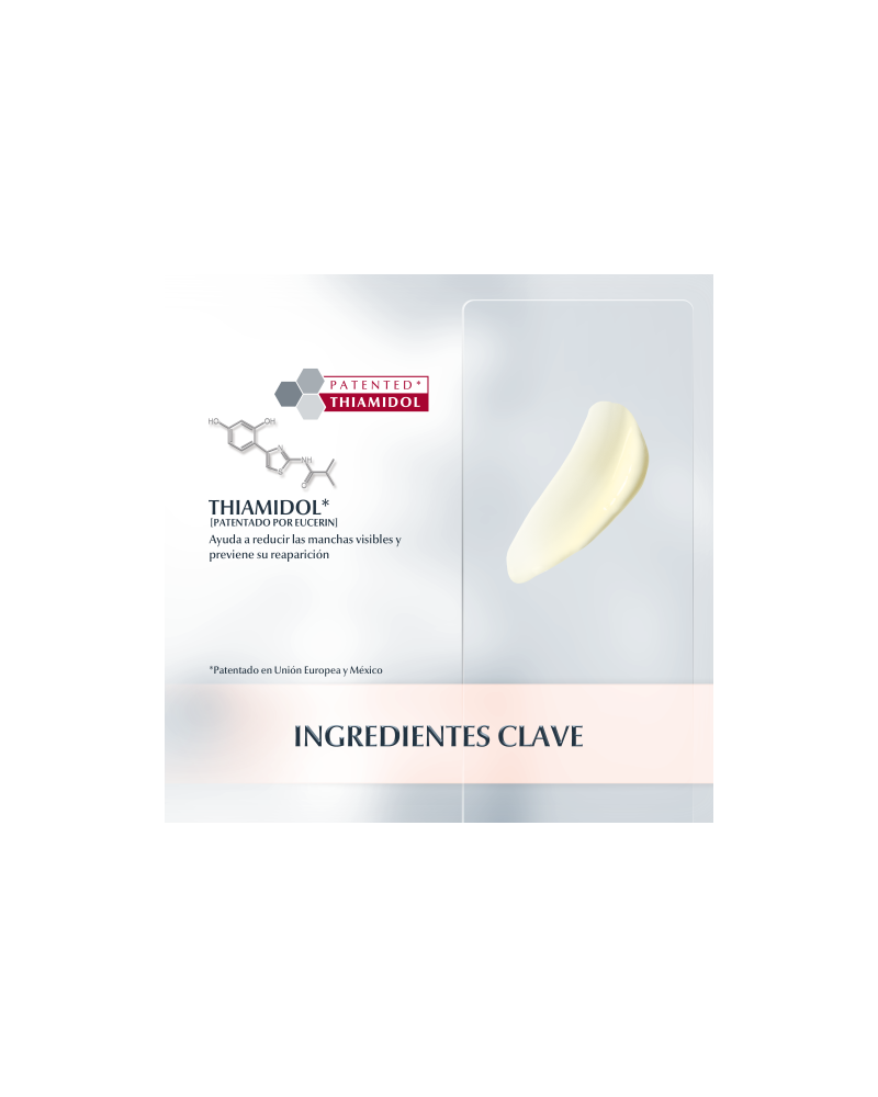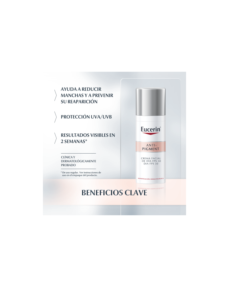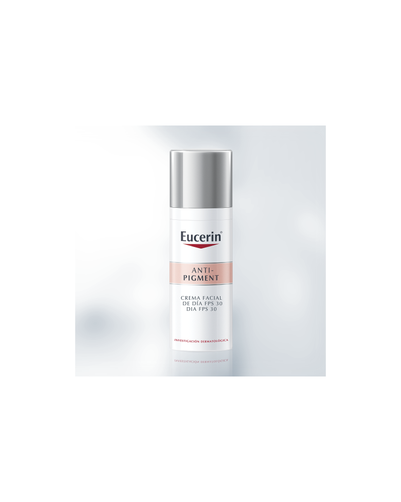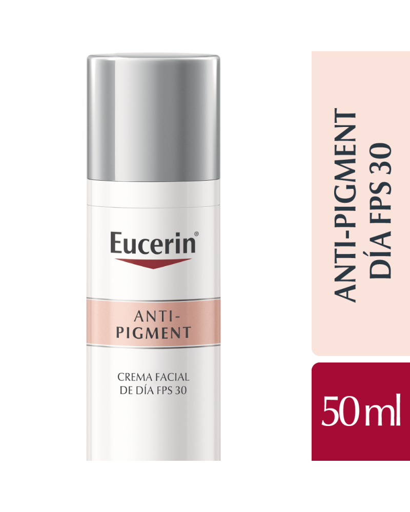 Eucerin Anti-Pigment Día FPS 30 contiene thiamidol, un ingrediente eficaz y patentado que actúa en la causa principal de la hiperpigmentación al reducir la producción de melanina. Se ha probado clínica y dermatológicamente que este componente reduce las manchas y previene su reaparición. Los primeros resultados son visibles después de 2 semanas y mejora de forma continua con su uso regular. Con los filtros UVA y UVB (FPS 30), la crema hidratante de día ofrece una protección eficaz contra el sol y Beneficios. Reduce las posibilidades de que la piel desarrolle manchas de pigmentación inducidas por el sol. La piel luce uniforme y radiante. Modo Uso. Aplicación: 1) Limpiá la piel con DermatoCLEAN Loción Micelar 3 en 1 (para todo tipo de piel) o DermatoCLEAN Leche (para piel seca) 2) Tonificá y prepará la piel para la crema de cuidado con DermatoCLEAN Tónico 3) Aplicá Eucerin Anti-Pigment Serum Dual con un suave masaje en el rostro. 4) Aplicá una crema de cuidado o un hidratante en el contorno de ojos 4) Completá tu rutina diaria con Eucerin Anti-Pigment Crema Día FPS30. 5) Si vas a estar expuesta al sol por un tiempo prolongado, podés aplicar protección solar adicional (FPS50+)