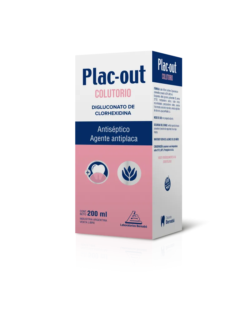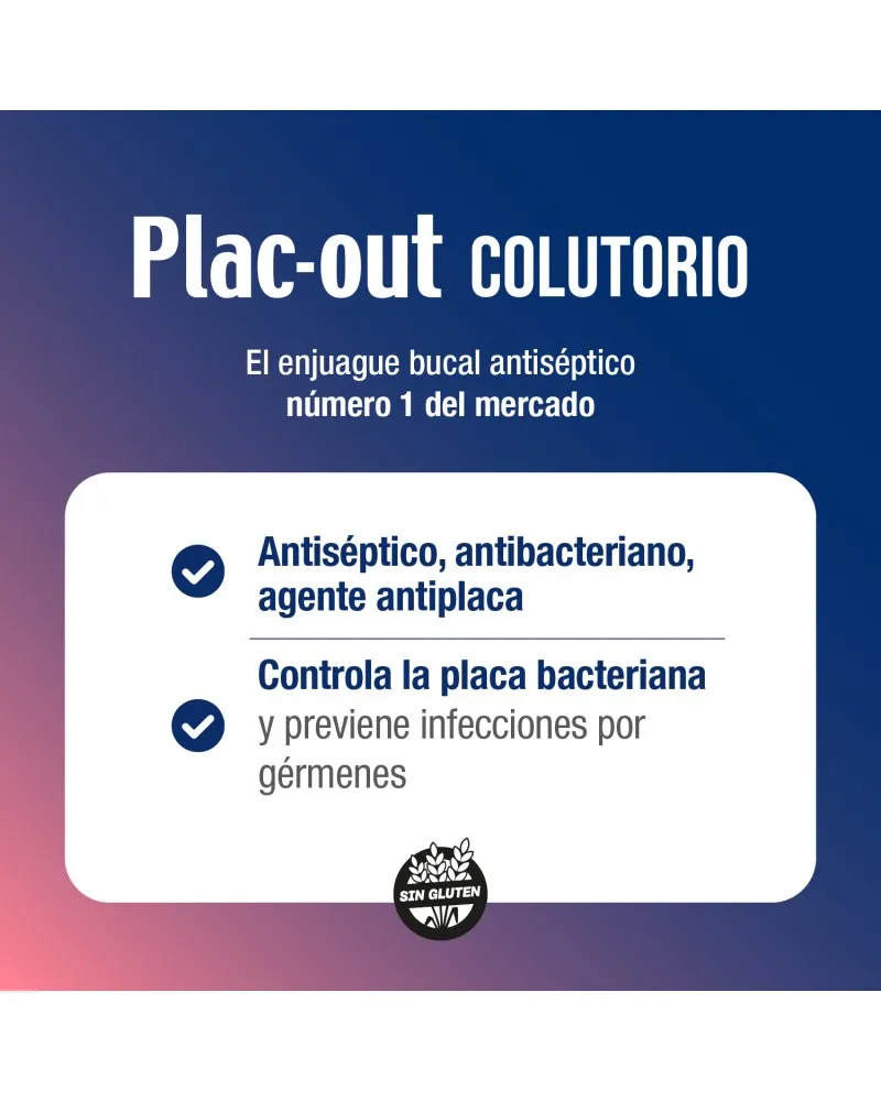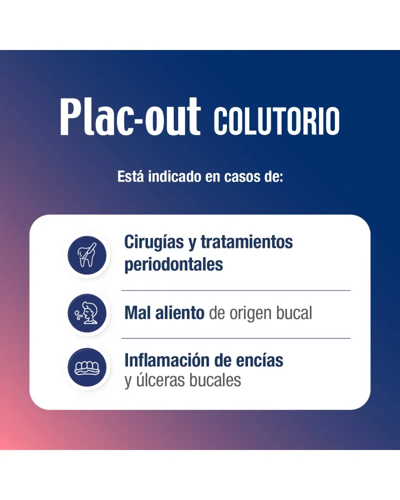 Plac-Out Colutorio es el enjuague bucal antiséptico número 1 del mercado. Es indicado por odontólogos para: - Prevención de infecciones por gérmenes de la cavidad bucal. - Mejoría sintomática de la inflamación de encías y úlceras bucales. - Halitosis (mal aliento) de origen bucal. - Control de la placa bacteriana. - En cirugías y tratamientos periodontales.