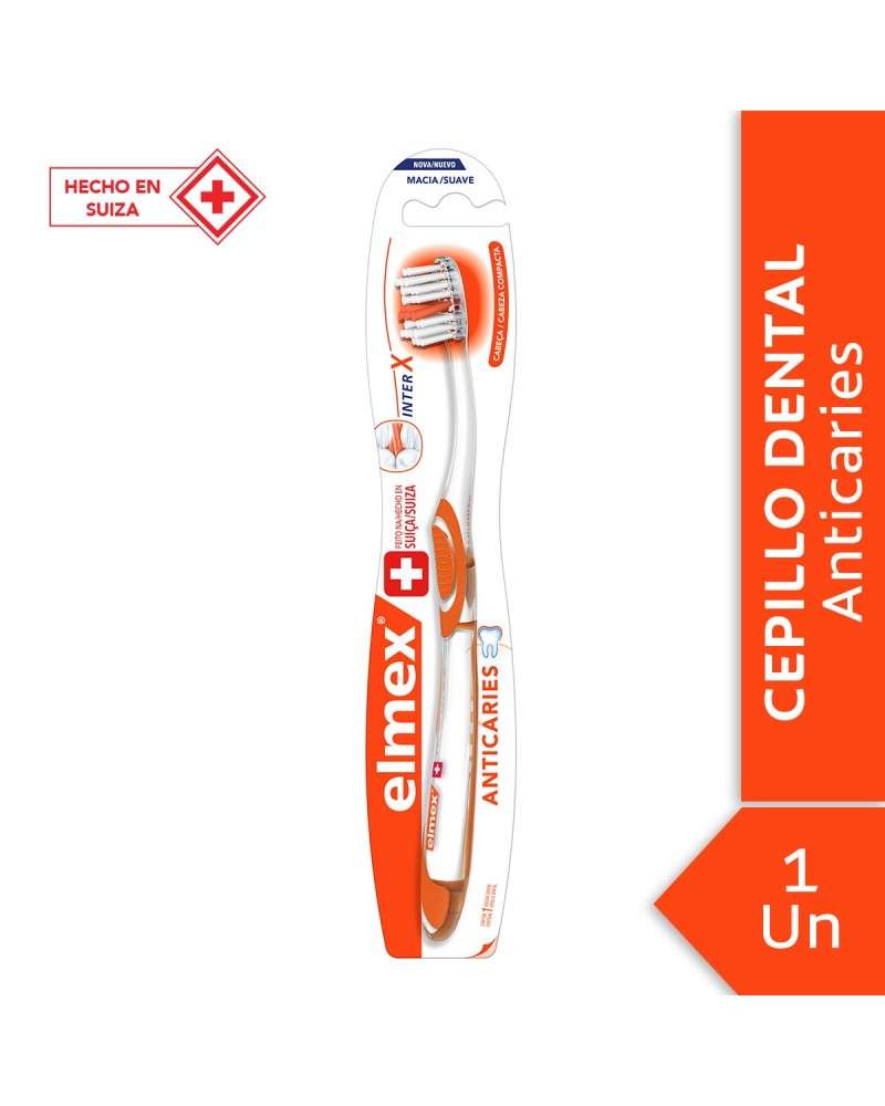 Nuevo cepillo dental elmex® Anticaries, para la limpieza de los molares difíciles de alcanzar Beneficios: -Cerdas inter-X para una limpieza completa de los espacios interdentales -Cabeza compacta para la limpieza de los últimos molares difíciles de alcanzar -Con el cepillado regular, remueve la placa y ayuda a prevenir la caries -Mango ergonómico *Hecho en Suiza *Desarrollado en colaboración con odontólogos y testeado científicamente Modo de uso: Cepíllese adecuadamente los dientes después de cada comida, tres veces al día o según la recomendación de su odontólogo. Enjuagar completamente después del cepillado. Después de usar, enjuagar la cabeza del cepillo, sacudir el exceso de agua y almacenar verticalmente. Mantener el cepillo en un lugar limpio y seco. Los odontólogos recomiendan limpiar la lengua como una parte importante de la higiene bucal diaria Precauciones: Producto no perecedero. No usar si el empaque está abierto Los odontólogos e higienistas recomiendan cambiar el cepillo de dientes cada 3 meses
