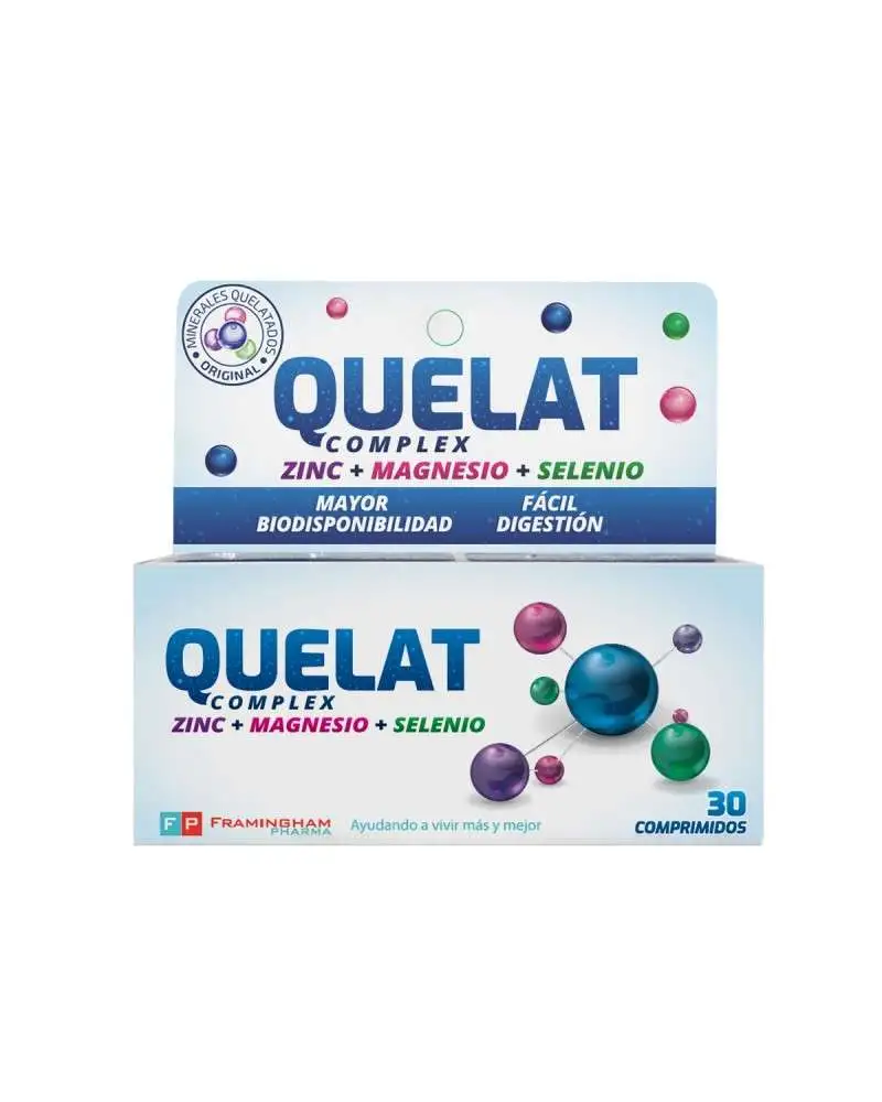 Quelat Complex x 30 comprimidos Magnesio, Selenio y Zinc. QUELAT es un desarrollo innovador, científico y tecnológico que ha permitido transformar los minerales inorgánicos en una forma orgánica (quelatados), facilitando la absorción de los minerales. Los minerales desempeñan un papel muy importante en el organismo, ya que son necesarios para la elaboración de tejidos, para la síntesis de hormonas y en la mayor parte de las reacciones químicas en las que intervienen enzimas. Ayuda a una mejor calidad de piel, uñas y cabello. Intervenienen en el sistema de defensas de nuestro organismo. La quelación es un proceso natural que ocurre en el intestino para facilitar el transporte de minerales nutricionales a través de la pared intestinal como parte de la digestión. Lamentablemente nuestro organismo no es muy eficiente en la producción de minerales quelados. Incorporando directamente los minerales aminoquelados se logra una mayor eficiencia de absorción y biodisponibilidad. El proceso de quelación desarrollado logra moléculas con pesos moleculares suficientemente pequeñas como para pasar fácilmente a través de la pared intestinal. Los minerales QUELAT son idénticos a los generados por el organismo humano en el proceso de quelación natural.