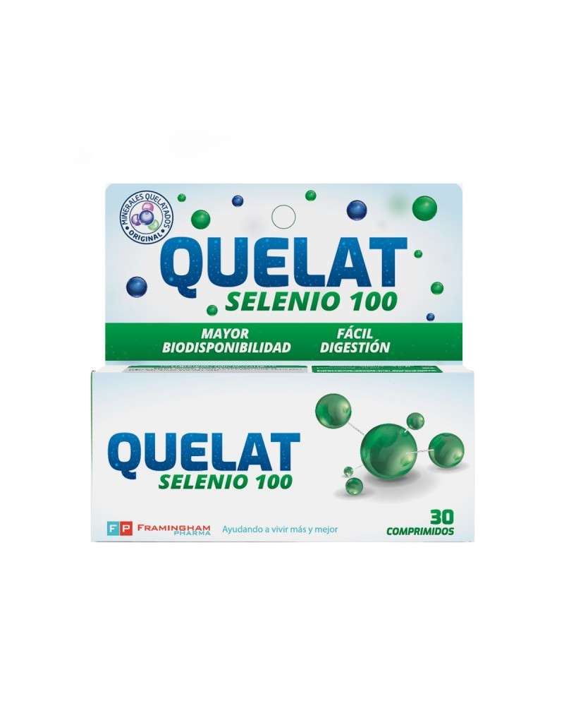 Quelat Selenio 100 x 30 comprimidos. Selenio quelatado. QUELAT es un desarrollo innovador, científico y tecnológico que ha permitido transformar los minerales inorgánicos en una forma orgánica (quelatados), facilitando la absorción de los minerales. Los minerales desempeñan un papel muy importante en el organismo, ya que son necesarios para la elaboración de tejidos, para la síntesis de hormonas y en la mayor parte de las reacciones químicas en las que intervienen enzimas. La quelación es un proceso natural que ocurre en el intestino para facilitar el transporte de minerales nutricionales a través de la pared intestinal como parte de la digestión. Lamentablemente nuestro organismo no es muy eficiente en la producción de minerales quelados. Incorporando directamente los minerales aminoquelados se logra una mayor eficiencia de absorción y biodisponibilidad. El proceso de quelación desarrollado logra moléculas con pesos moleculares suficientemente pequeñas como para pasar fácilmente a través de la pared intestinal. Los minerales QUELAT son idénticos a los generados por el organismo humano en el proceso de quelación natural.