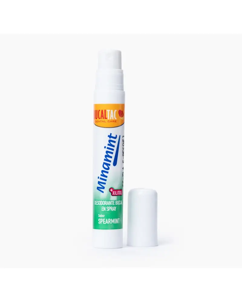 Desodorante bucal en spray. Ayuda a combatir el mal aliento. Aliento fresco durante horas. Rinde más de 70 Aplicaciones. Refresca tu aliento en cualquier momento del día. Práctico y liviano envase. Ideal para llevar a todas partes y utilizarlo cuando sea necesario. CON XILITOL • Reduce significativamente la placa bacteriana. • Es preventivo de caries. • Estimula la secreción salival. • Inhibe la desmineralización del esmalte. Sabor Spearmint.