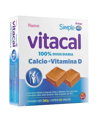 SIMPLE - Vitacal Calcio + Vitamina D x 60 Caramelos Precio $ 25.751,00 Una nueva forma de incorporar Calcio y Vitamina D. Simple Vitacal es un suplemento dietario a base de Calcio y Vitamina D presentado en caramelos... Agregar al carrito